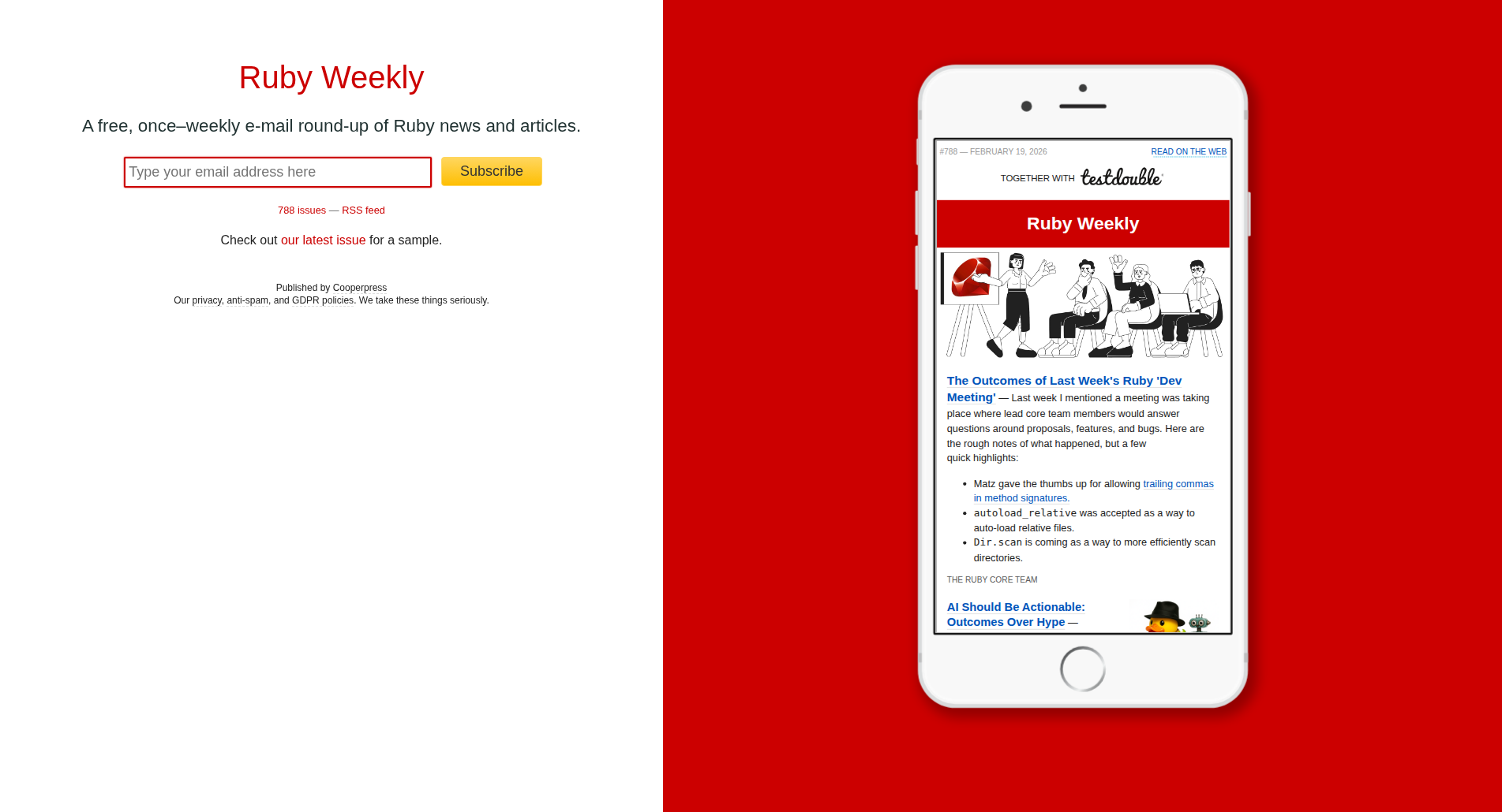 A free, once–weekly e-mail round-up of Ruby news and articles.